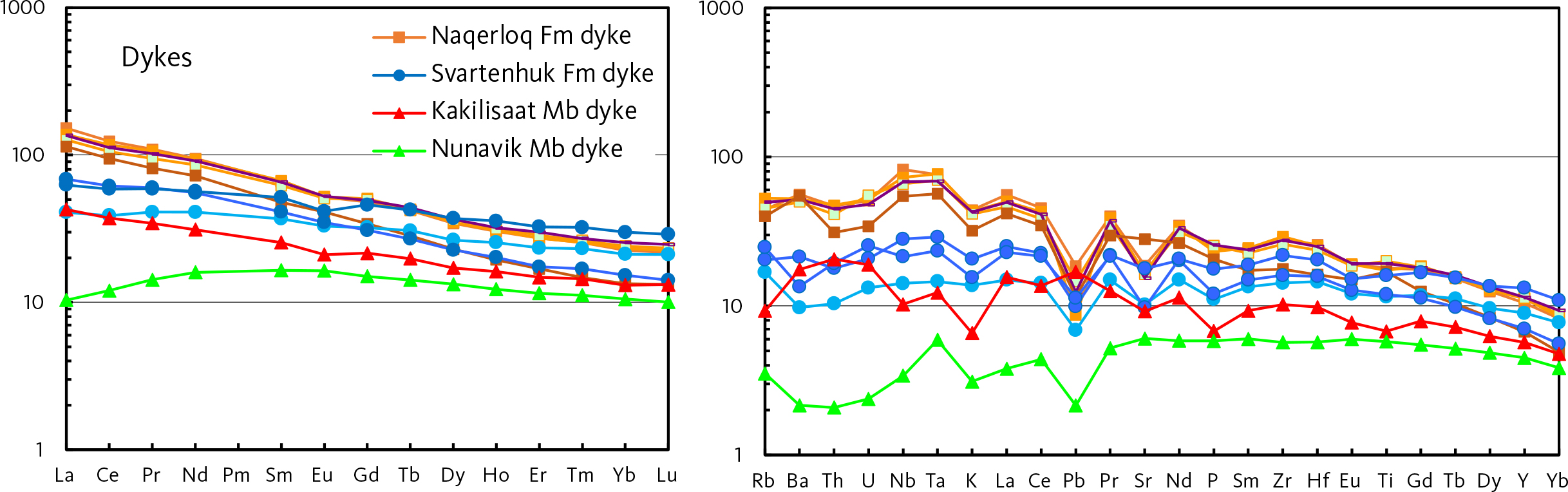 Picrite dykes and strongly contaminated dykes similar to the Kakilisaat Member are only found in the areas of the Vaigat Formation, whereas basaltic dykes are found all over Svartenhuk Halvø.