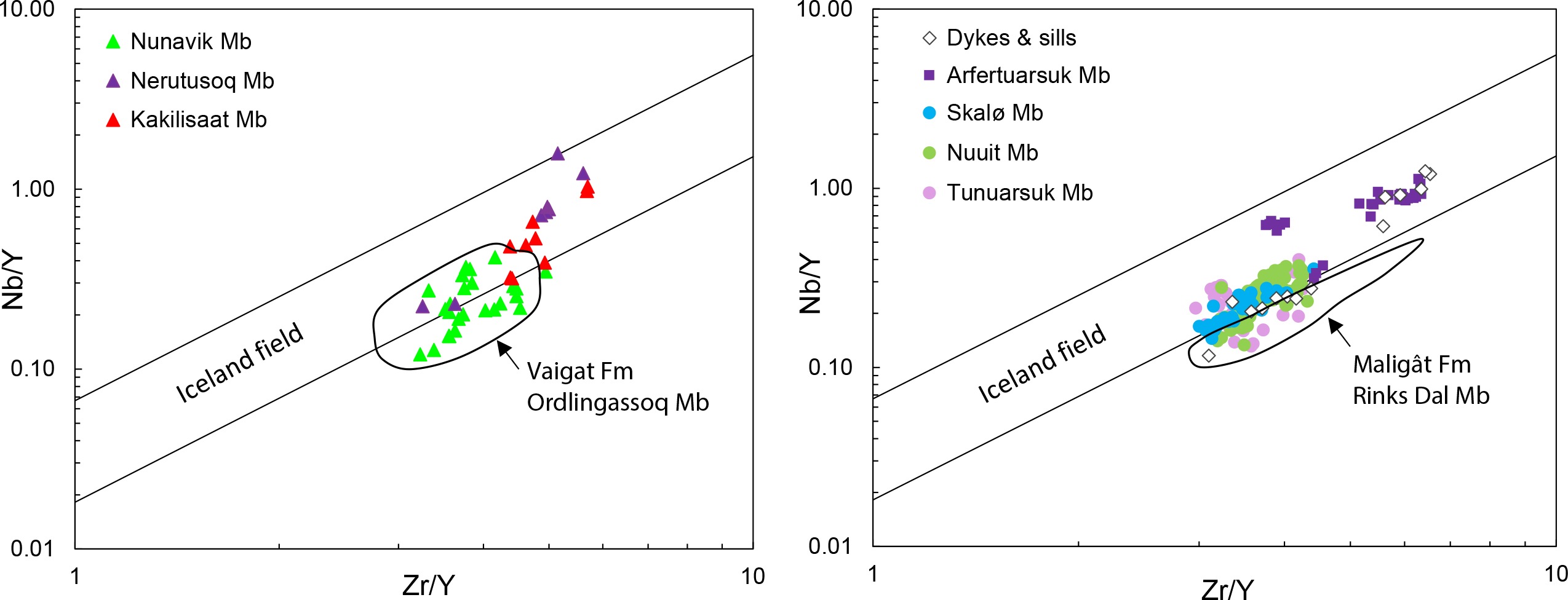 Our interpretations can be tested with isotope data, which are, however, currently not available. A corollary of the interpretations is that the enriched flows in the Tunuarsuk Member may have acquired their enrichment in two different ways, in the asthenosphere and in the lithosphere, which would contribute to their observed compositional variability. The existence of one or more enriched components in the basalts is precisely the reason why basalts of the Svartenhuk Formation can be chemically distinguished from basalts of the Maligât Formation, which lack such a component.