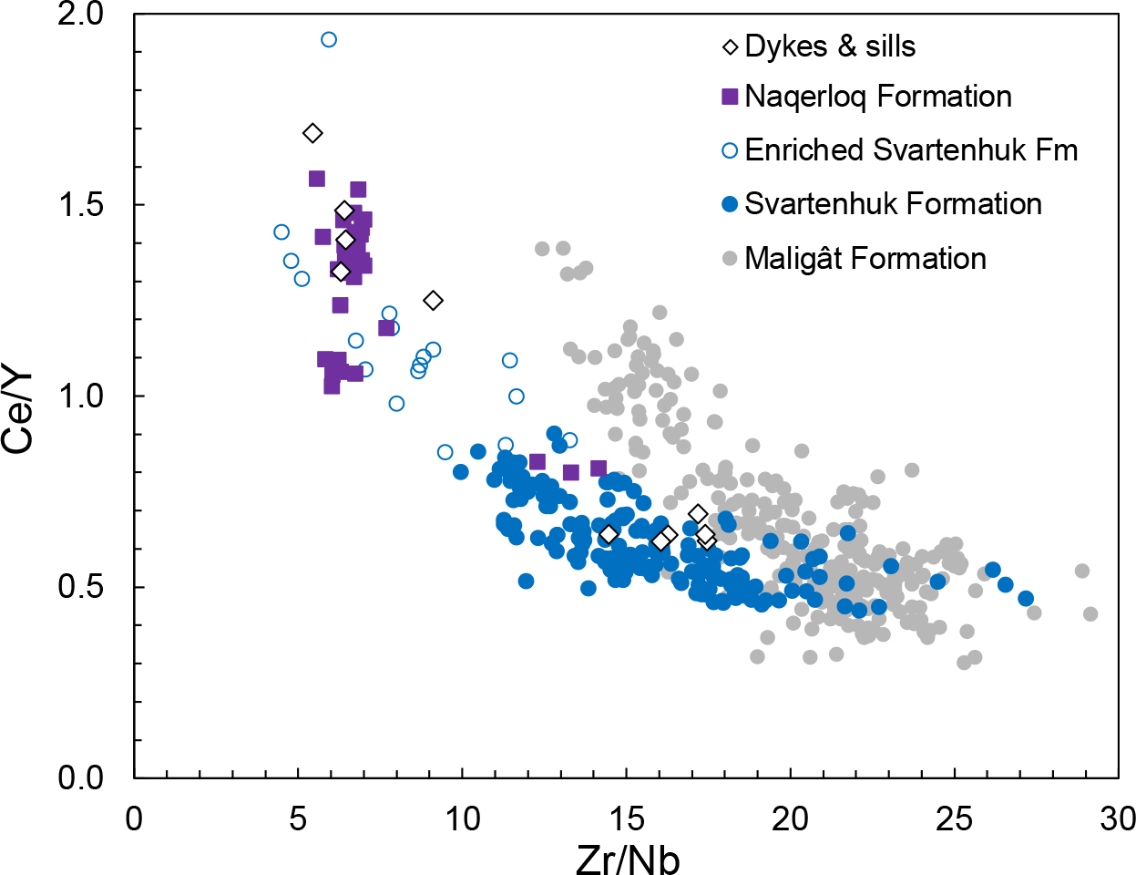 The basalts of the Svartenhuk Formation show small but significant compositional differences from the uncontaminated basalts of the Maligât Formation (the Rinks Dal Member) on Disko and Nuussuaq. Whereas in practice the major elements are indistinguishable, trace-element ratios (Figs 83 and 84) show that the Svartenhuk Formation basalts are shifted to higher LaN/SmN and higher Nb/Y than most of the Maligât Formation basalts, although there is a partial overlap with the Maligât Formation. The Svartenhuk Formation basalts have LaN/SmN in the range 0.8–1.6 and therefore the light REE curves cross each other, as illustrated in Fig. 79. In contrast almost all Maligât Formation basalts have LaN/SmN <1 and near-parallel REE curves (Larsen & Pedersen 2009; Pedersen et al. 2018). The two formations are best discriminated in a plot of Ce/Y vs. Zr/Nb (Fig. 85) where they occupy separate fields for Zr/Nb <19; the overlap area with Zr/Nb >19 is only sparsely occupied by Svartenhuk Formation basalts. The Naqerloq Formation occupies a separate field. Based on this diagram, Larsen et al. (2016) and Pedersen et al. (2018, fig. 101) found that the basalt dykes on Disko and Nuussuaq are different from the basalt lava flows of the Maligât Formation but similar to the lava flows of the Svartenhuk and Naqerloq Formations. The dyke ages yield similar results (Fig. 3). The basalt dykes on Disko and Nuussuaq are therefore thought to have fed lava flows of the Svartenhuk and Naqerloq Formations, which must have been present in that area but are now removed by erosion.