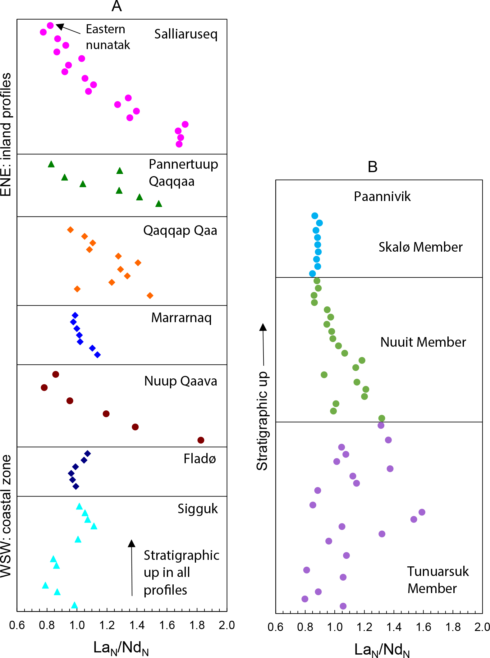 Only one analysed sample profile covers all three volcanic members of the Svartenhuk Formation: the Paannivik profile (64). The plot of LaN/NdN vs. stratigraphic height for this profile (Fig. 87B) shows that the three members have different styles of up-section variation. The Tunuarsuk Member shows a large compositional spread and no systematic up-section variation; the Nuuit Member shows the systematic decrease in LaN/NdN described above, and the Skalø Member has constant LaN/NdN throughout. Other analysed profiles through the Tunuarsuk and Skalø Members are less complete but indicate the same pattern of overall variation as at Paannivik. The data may be interpreted in terms of melting and mixing dynamics. In the Tunuarsuk Member, the melt batches from the mantle did not mix efficiently in the magma chamber where they fractionated, and both very depleted melts with LaN/NdN around 0.8 and very enriched melts with LaN/NdN up to 1.6 were preserved and erupted. This may have been caused by relatively short residence times in the magma chamber, which also led to more magnesian basalts than in the two subsequent members. In the Nuuit Member mixing of the individual melt batches intruded into the magma chamber became much more efficient, though not complete in the beginning, and at the same time the amount of enriched melt gradually diminished with further melting. In the Skalø Member, mixing was either perfect or the enriched mantle component had been exhausted; the low LaN/NdN ratio of 0.9 suggests the latter.
